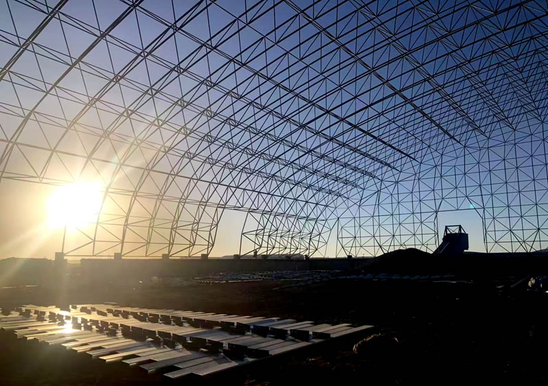 3、材料:正放四角錐螺栓球節(jié)點(diǎn)網(wǎng)架,按照甲方確認(rèn)的圖紙?jiān)O(shè)計(jì)要求加工制作。網(wǎng)架主材材質(zhì)為Q355B鋼管,底漆二道70um,主檁條鍍鋅C型鋼C220*75*20*3.0,次檁條鍍鋅C型鋼C180*70*20*2.5,屋面板0.5mm厚彩鋼單板